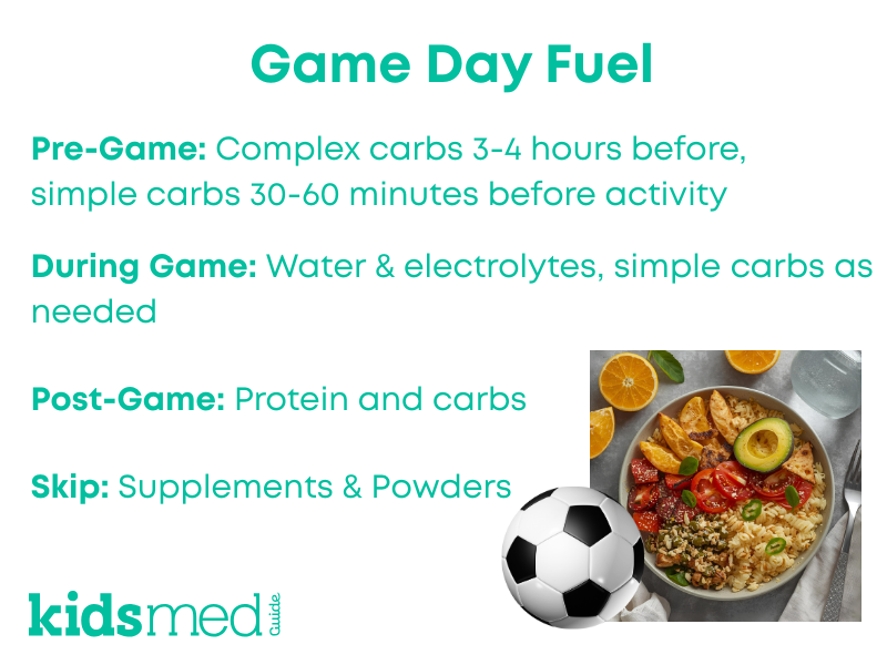 Sleep, rest days, and time off for schoolwork and unstructured fun are just as important! Focus on growth, health, and play. Hydration is important every day and can be monitored with simple cues like urine color and routine drinking before, during, and after activity.