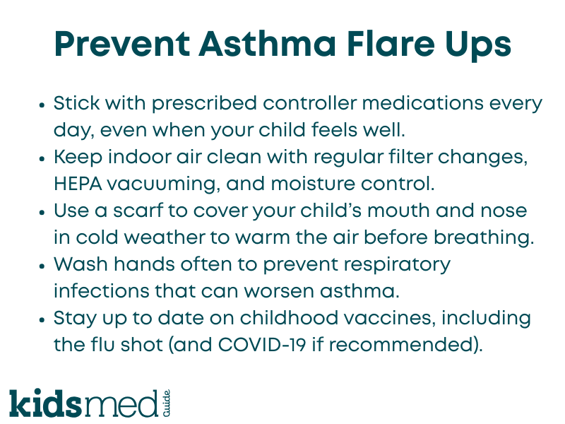- Talk to your pediatrician about vaccines. We recommend keeping all childhood vaccines up to date. The flu and COVID-19 vaccines help prevent respiratory infections that can trigger asthma flare-ups. The flu vaccine is recommended for all children aged 6 months and older. The COVID-19 vaccine may be advised based on your child’s age, health, and social situation—consult your doctor for guidance!
